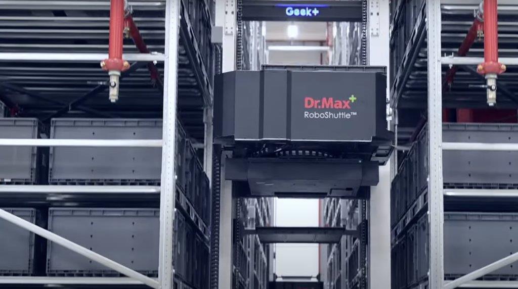 Dr. Max’s new warehouse in Telgate, Bergamo, Italy, maximizes vertical space and provides room for 16,000 containers across 14,000 square meters. In the first phase, Geekplus Europe implemented a 1,300-square-meter solution that manages 11,000 products for e-commerce and pharmacies in Italy. Fifty high-speed P40 picking robots handle storage, retrieval, and transportation to five tote-to-person stations. Twenty two RoboShuttles store bins double-deep in the aisles, utilizing warehouse space up to five times more efficiently. The system processes an average of over 200 containers per hour per station.