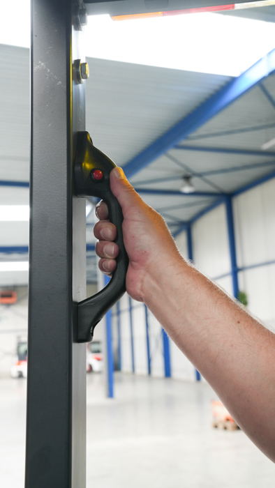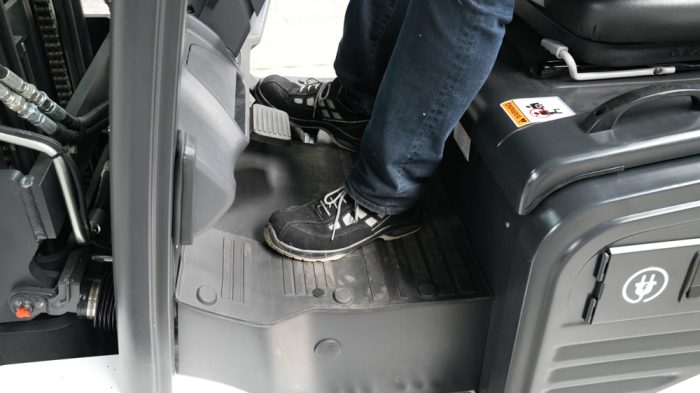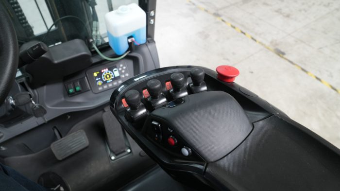 The spacious entry/exit with anti-slip profile and the long hand grip ensure easy access. The footplate is extremely spacious and free of obstacles. The seating position is fine. The angle of the steering column is continuously adjustable and the Grammer MSG65 – with two armrests – is easily adjustable. On the right armrest, we see the electric fingertip levers for mast control, the direction switch, horn, emergency stop and a push button for automatic mast vertical positioning. On the rear right roof pillar, there is a handle with a horn.