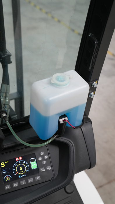 The B25NS is quite richly equipped for a basic truck. The cab has a windscreen and a roof window, front and rear driving lights, bright work lights, a flashing light and a BlueSpot at the rear. To the right of the seat is a storage compartment with a cup/bottle holder, USB connection and paper clip. On the left side of the dashboard, there is another compartment with a cover plate, but its purpose is unclear. In our opinion, the windscreen washer reservoir could be placed underneath it.