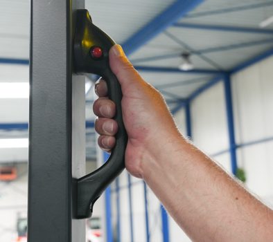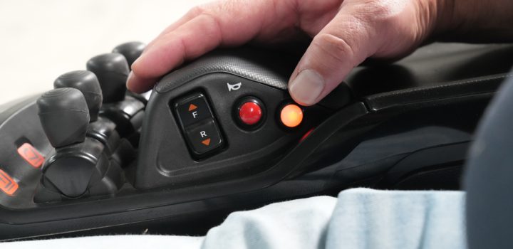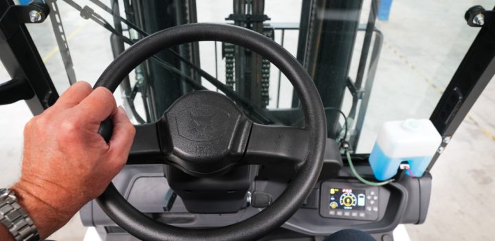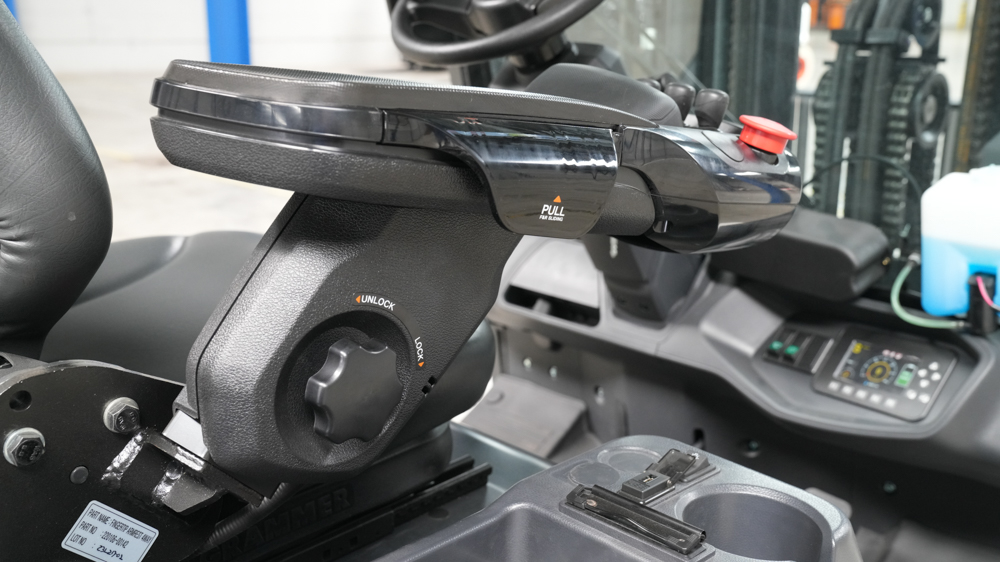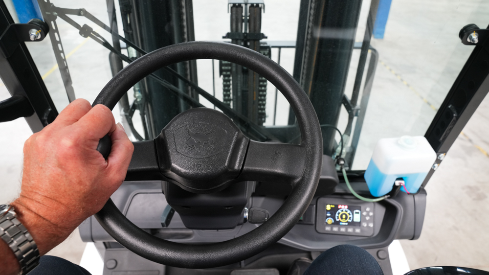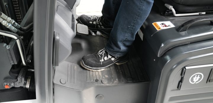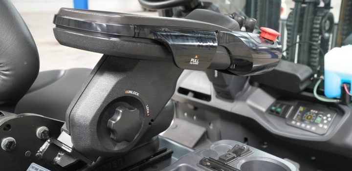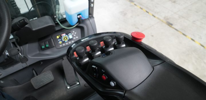 The spacious entry/exit with anti-slip profile and the long hand grip ensure easy access. The footplate is extremely spacious and free of obstacles. The seating position is fine. The angle of the steering column is continuously adjustable and the Grammer MSG65 – with two armrests – is easily adjustable. On the right armrest, we see the electric fingertip levers for mast control, the direction switch, horn, emergency stop and a push button for automatic mast vertical positioning. On the rear right roof pillar, there is a handle with a horn.