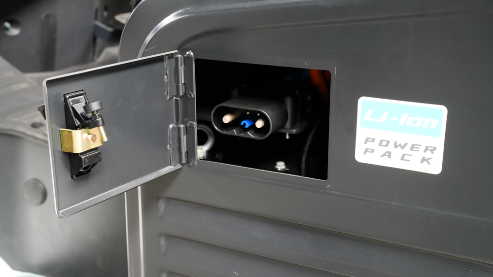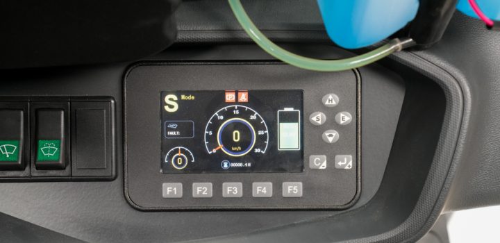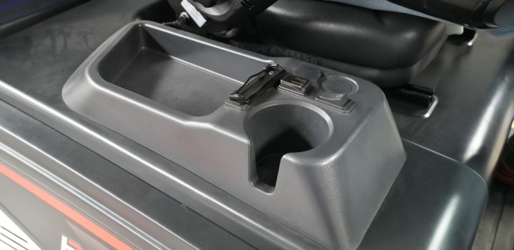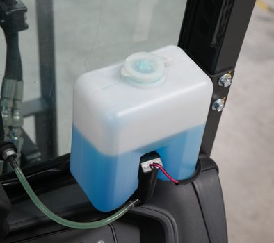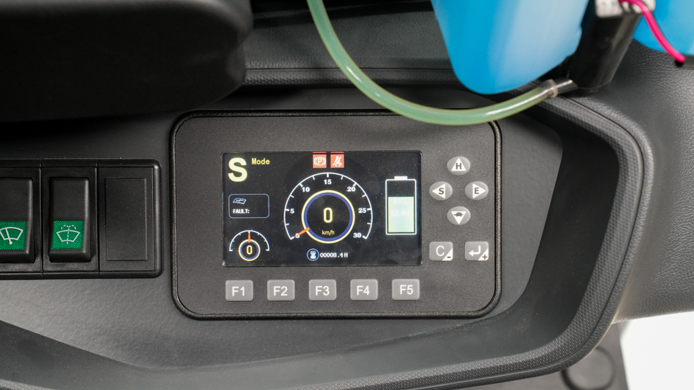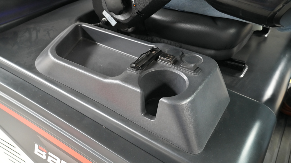 The B25NS is quite richly equipped for a basic truck. The cab has a windscreen and a roof window, front and rear driving lights, bright work lights, a flashing light and a BlueSpot at the rear. To the right of the seat is a storage compartment with a cup/bottle holder, USB connection and paper clip. On the left side of the dashboard, there is another compartment with a cover plate, but its purpose is unclear. In our opinion, the windscreen washer reservoir could be placed underneath it.