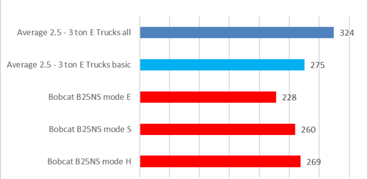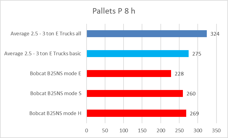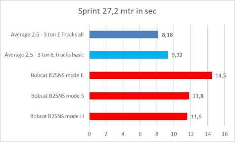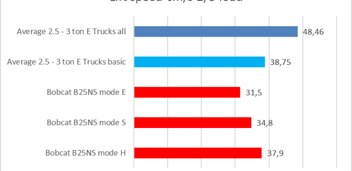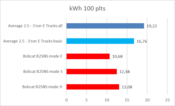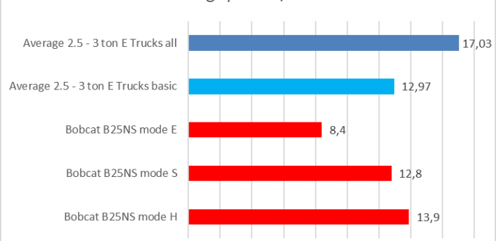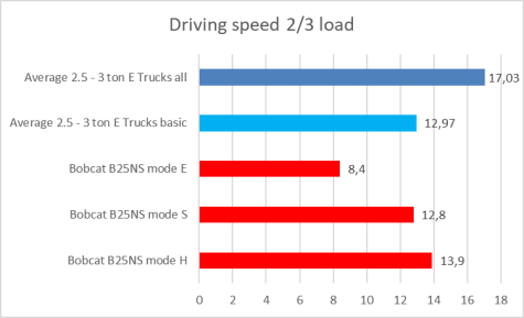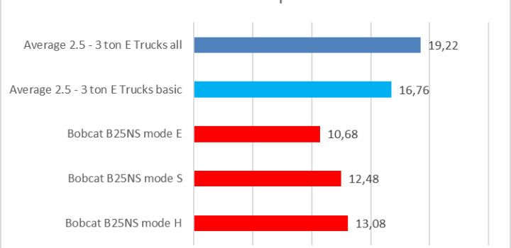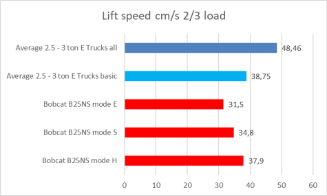 In terms of performance, the Bobcat B25NS scores in line with expectations. Compared to tested 2.5-tonne electric forklifts for more intensive use, this Bobcat scores modest productivity in the maximum H setting, but also extremely modest energy consumption. Compared to trucks intended for average to light use, the B25NS is closer to the average. It is slightly less productive, but more economical.